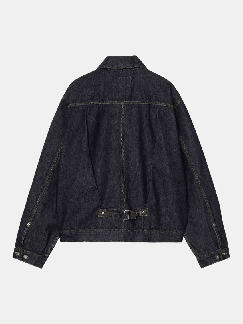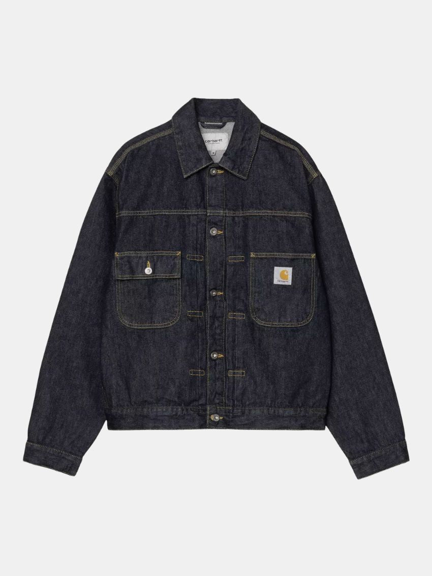 Jakke fra Carhartt fremstillet af kraftig, uforet bomuldsdenim, der giver et råt og holdbart udtryk. Jakken har to brystlommer og to sidelommer og er forstærket med bartack-syninger og metalnitter ved udsatte punkter for ekstra slidstyrke. Den justerbare pasform sikres med knapstrop bagpå og manchetter med knaplukning. Et vævet Square Label fuldender designet.
