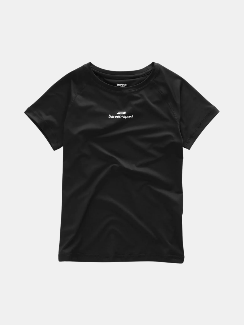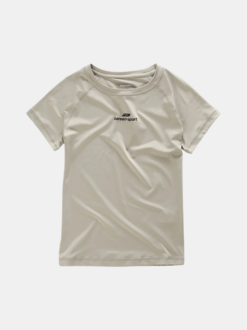 Stretch Tee fra Bareen fremstillet i et blødt og strækbart funktionsmateriale, der sikrer høj komfort og bevægelsesfrihed – både til træning og hverdag. Den tætsiddende pasform fremhæver kroppens form, mens de korte raglanærmer giver et sporty og fleksibelt fit. T-shirten er designet med en flot høj hals uden synlige sømme, som giver et rent og stilrent udtryk, og afsluttes med et hvidt logoprint på fronten.