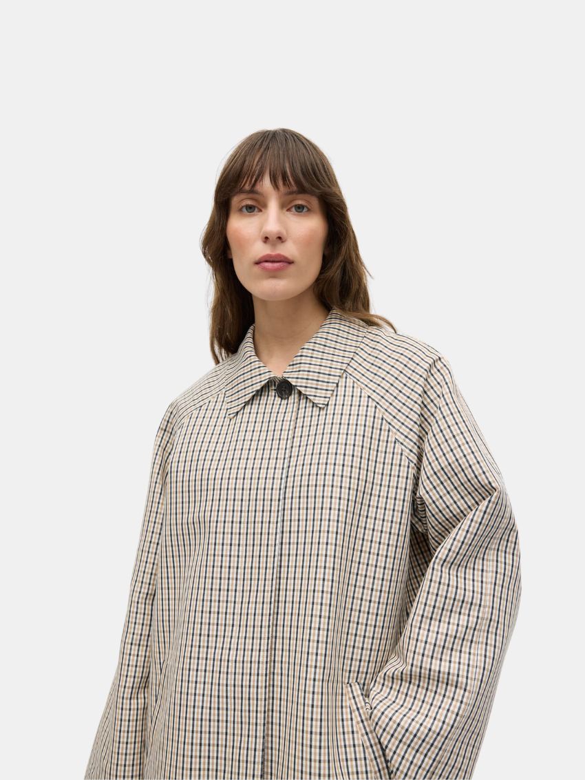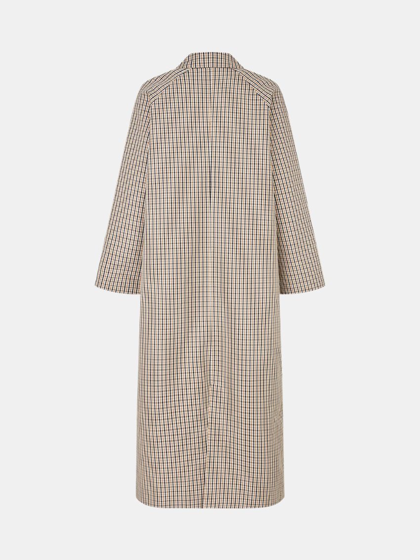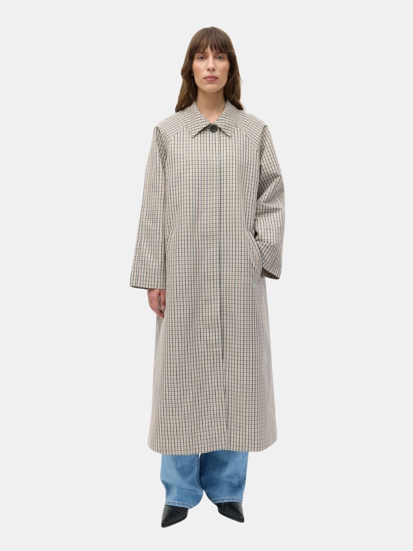 Lang frakke med afslappet pasform og et subtilt mikroternet mønster fra Envii. Modellen har skjult knaplukning foran, spids krave, lige manchetter og et rent, lige snit forneden. Designet med diskrete sidelommer i sidesømmene og fuldt foer for et komfortabelt og elegant fald. Fremstillet i en blød og holdbar bomuldsblanding.