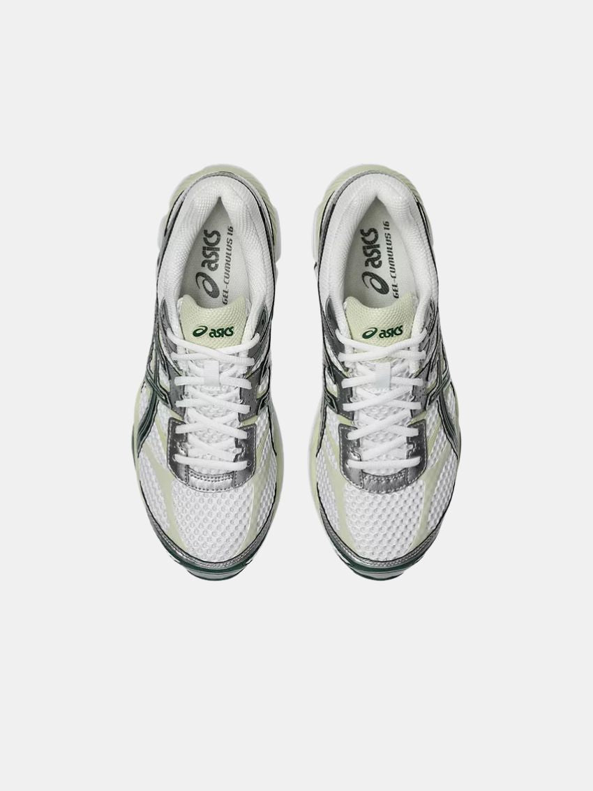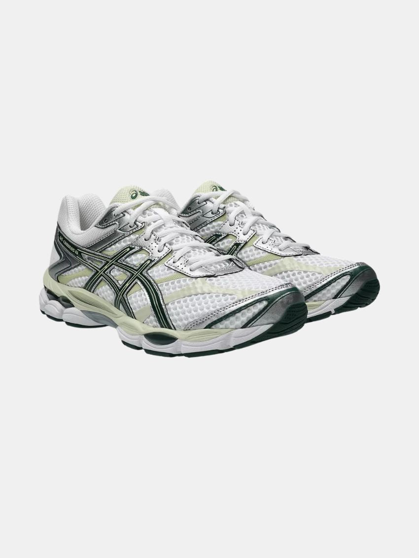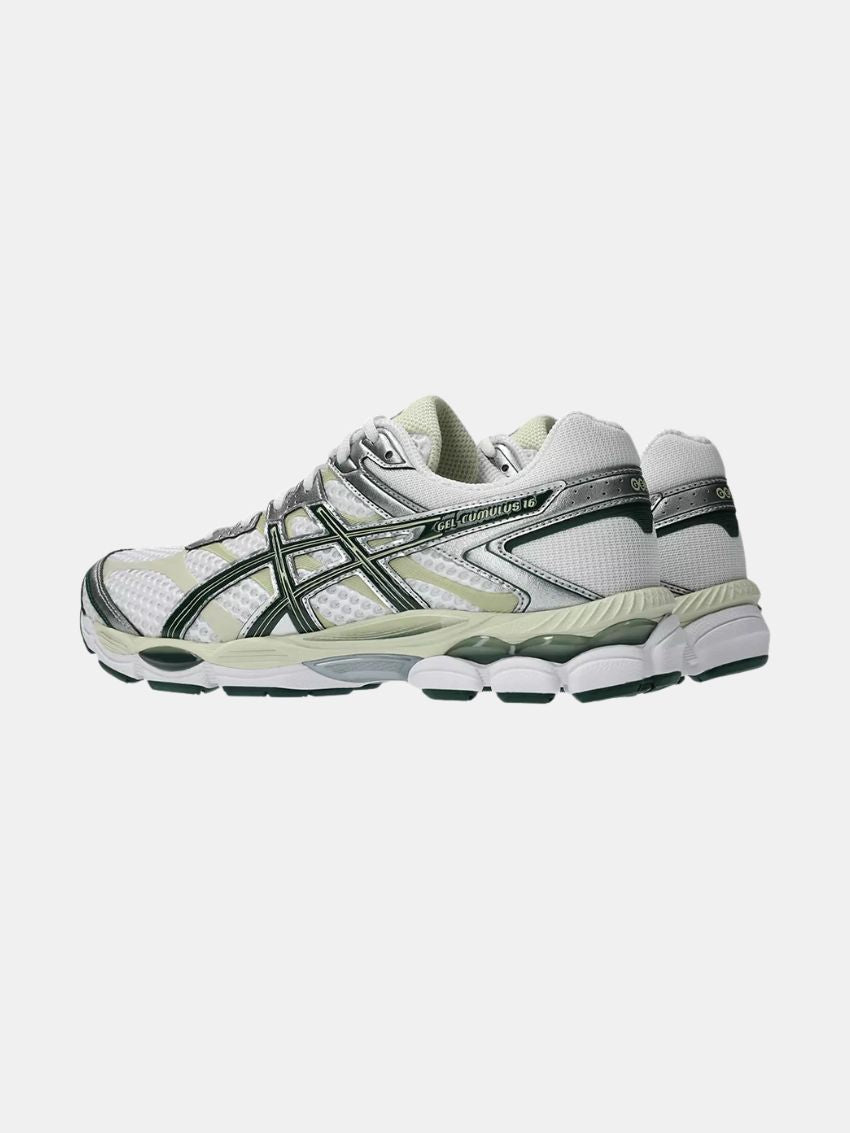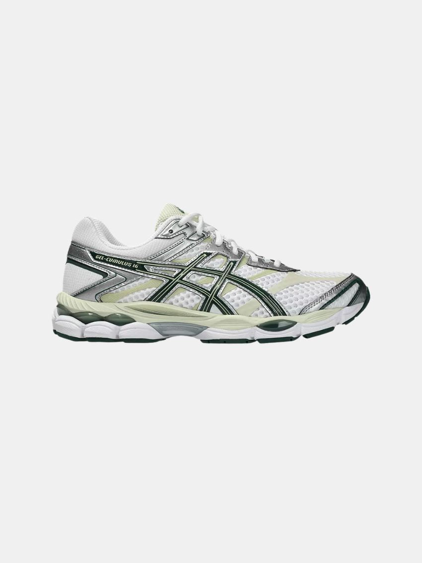 GEL-CUMULUS 16 blev oprindeligt lanceret i 2014 og er kendt for sine bløde, stødabsorberende egenskaber, særligt velegnet til længere distancer. Overdelen kombinerer blanke syntetiske læderoverlays, sømløse paneler og åbne mesh-underlag, som tilsammen skaber et teknisk udtryk, karakteristisk for 2010’ernes performance-løbesko.