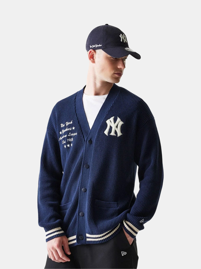 Cardigan i navy med knaplukning foran og frontlommer på begge sider fra New Era. Venstre bryst prydes af et boucle New York Yankees-logo, højre bryst har broderet wordmark, og venstre ærme er dekoreret med New Era-flag. Unisex-model.
