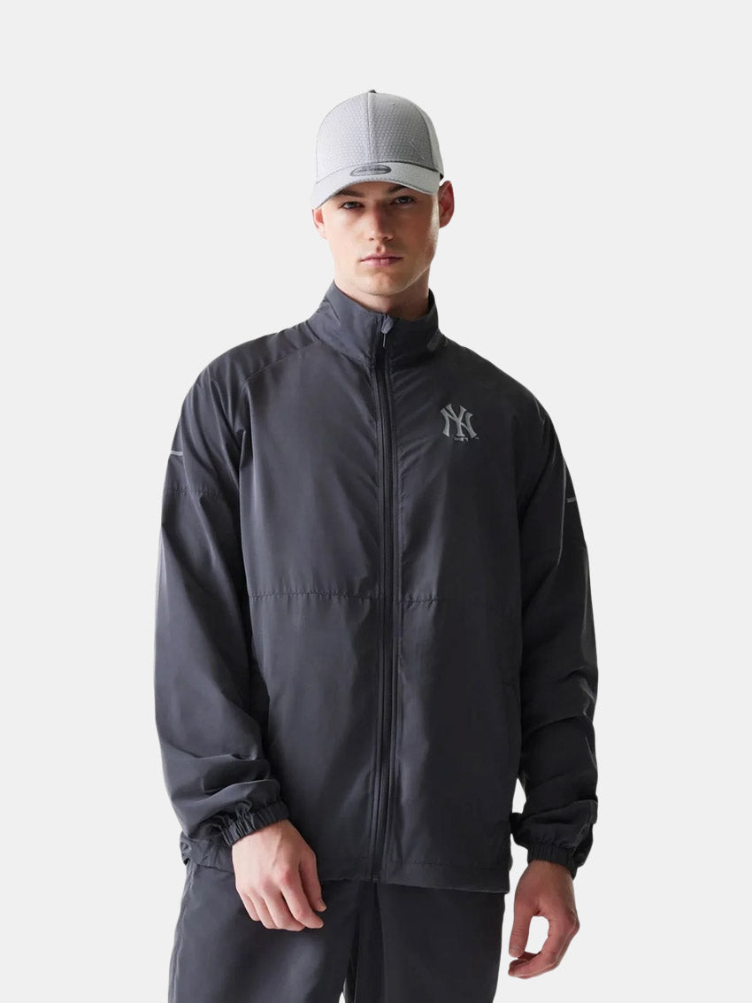 Jakke i mørkegrå med fuld lynlås foran og frontlommer på begge sider fra New Era. Venstre bryst prydes af New York Yankees-logo, ærmerne har reflekterende stribedetaljer, og venstre ærme er dekoreret med New Era-flagbroderi.
