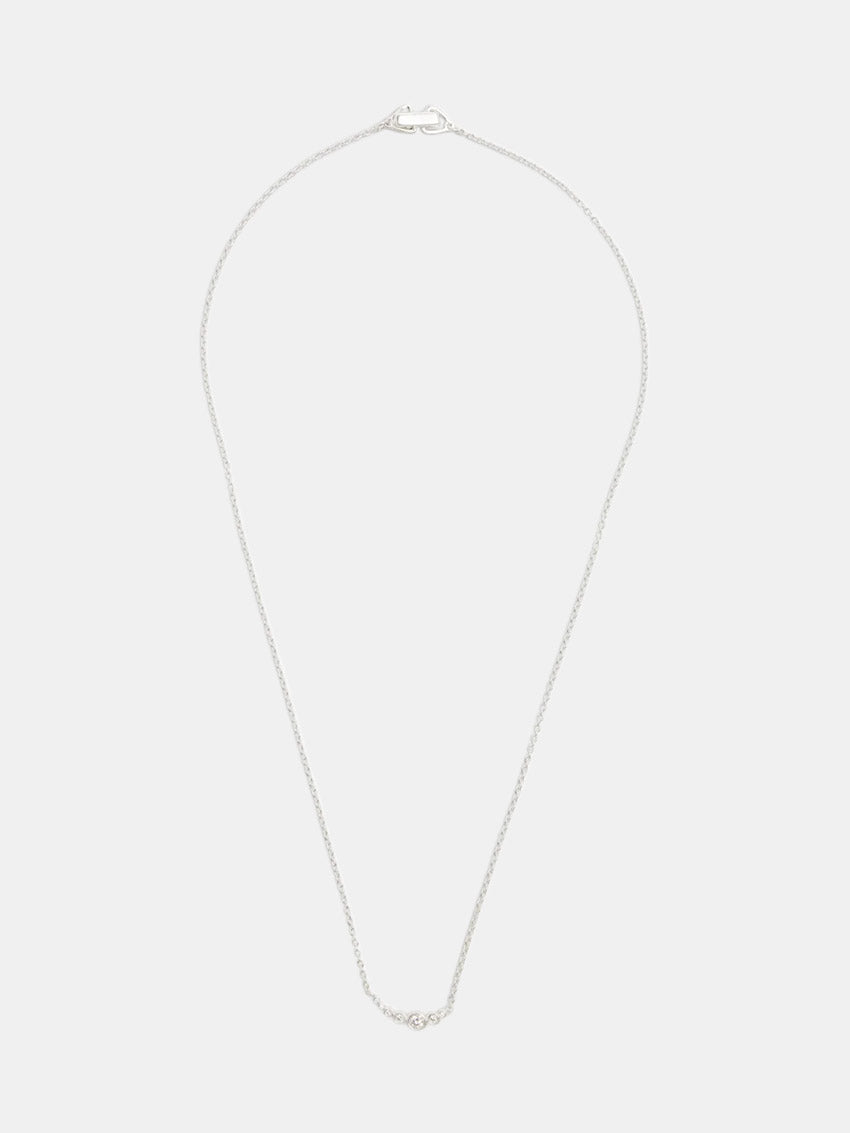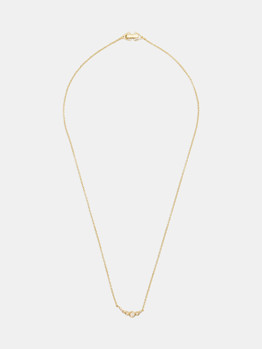 Elegant halskæde med et raffineret halvmånevedhæng, pyntet med funklende kubiske zirkonia i graduerede størrelser fra RAGBAG. Et minimalistisk smykke, der tilfører et subtilt strejf af glans og sofistikation til ethvert outfit.