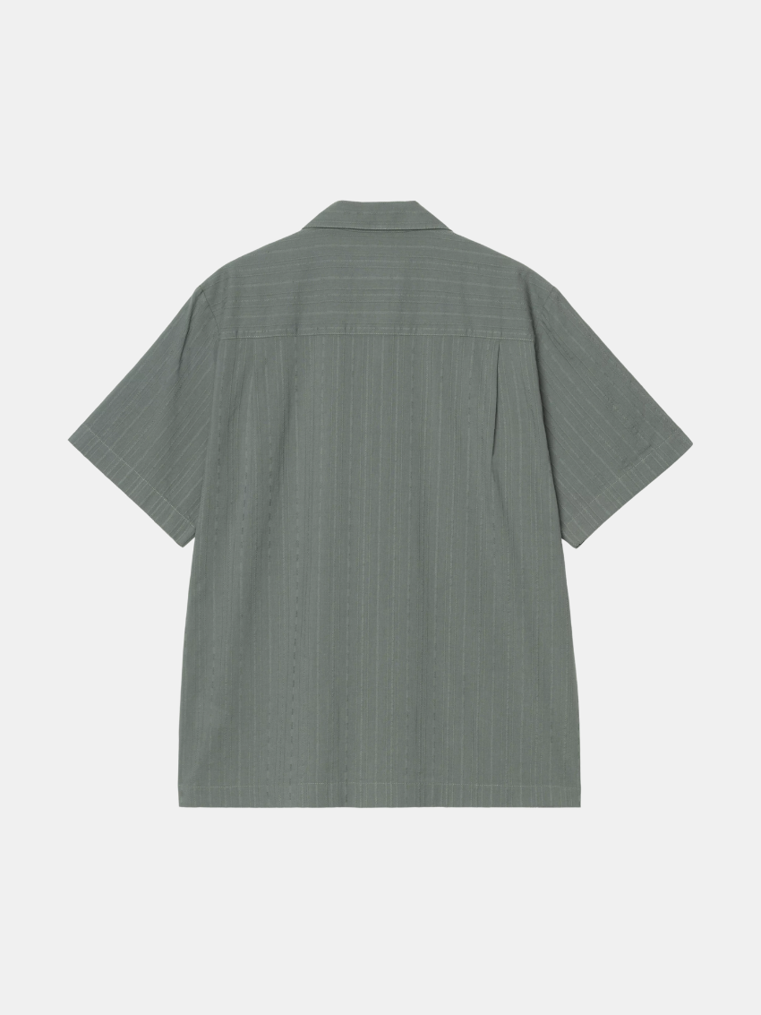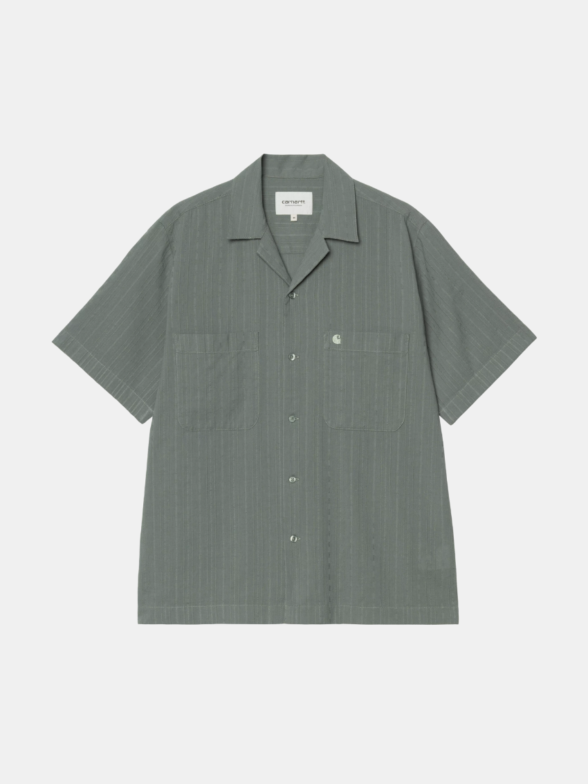 Gareth S/S Shirt fra Carhartt er en kortærmet skjorte med loose fit, fremstillet i let bomuld, som er garment-washed for en blødere følelse og et diskret brugt look. Skjorten har bowling-krave, knaplukning og to brystlommer, og designet afsluttes med et broderet ‘C’-logo.