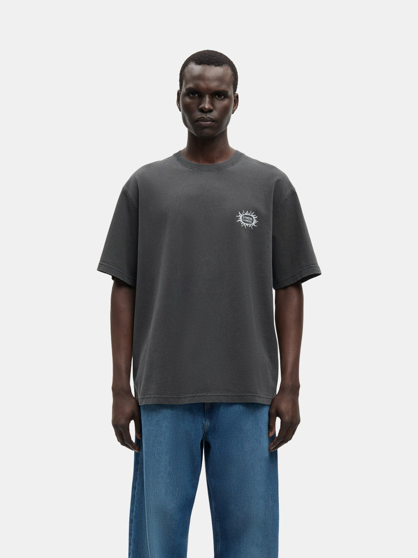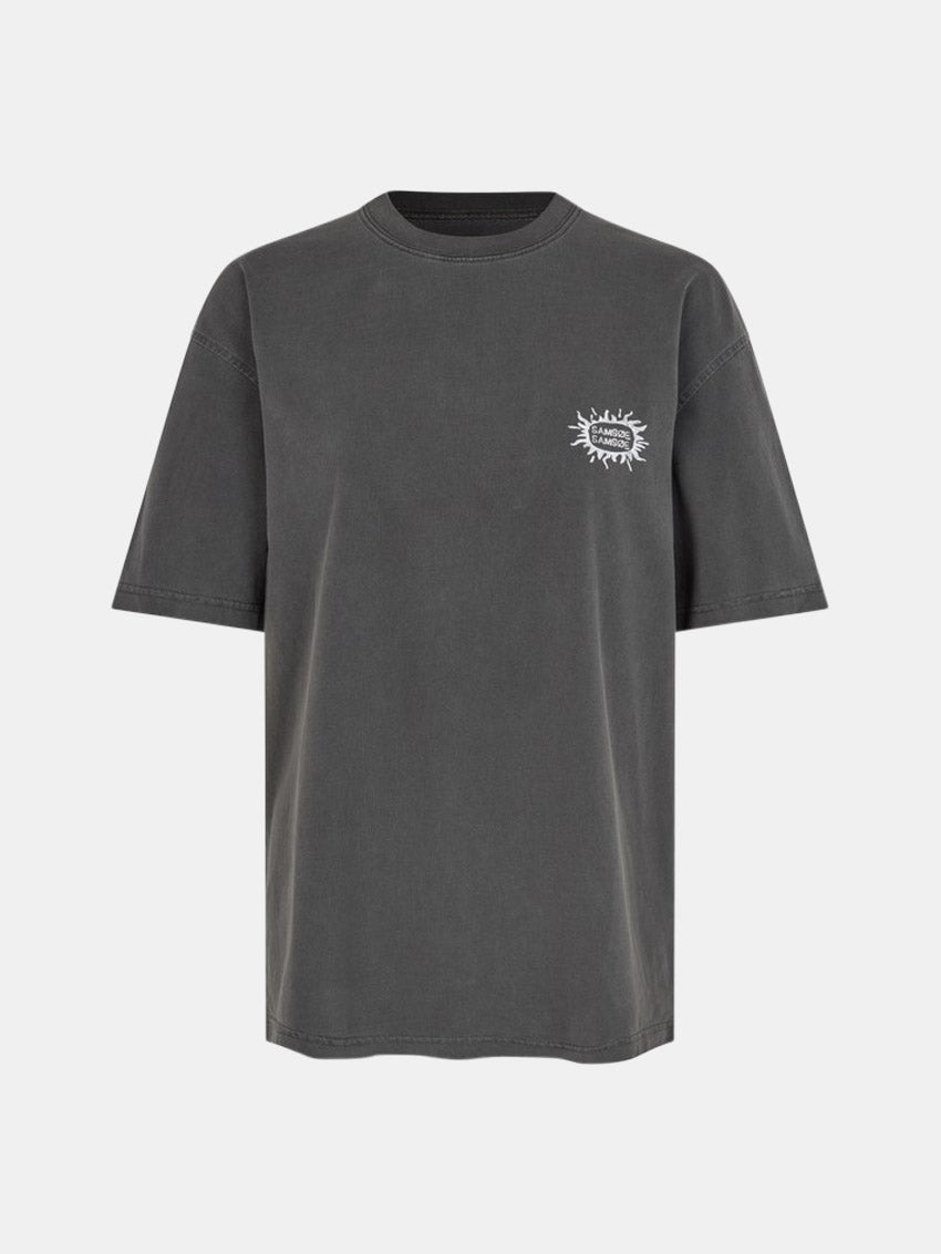 Kortærmet jersey-T-shirt med oversize pasform og sænkede skuldre fra Samsøe Samsøe. Designet med ribstrikket rund hals, vasket look og logoprint på brystet samt grafisk print på ryggen.