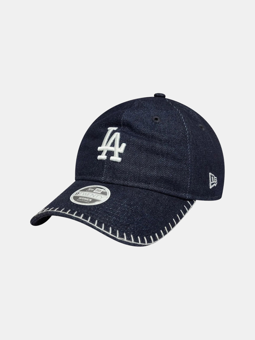 Navy cap med et LA Dodgers-logo broderet på fronten samt New Era-flag broderet på venstre side. Designet har ustruktureret krone, buet skygge med synlige stikninger på oversiden og justerbar strapback-lukning.
